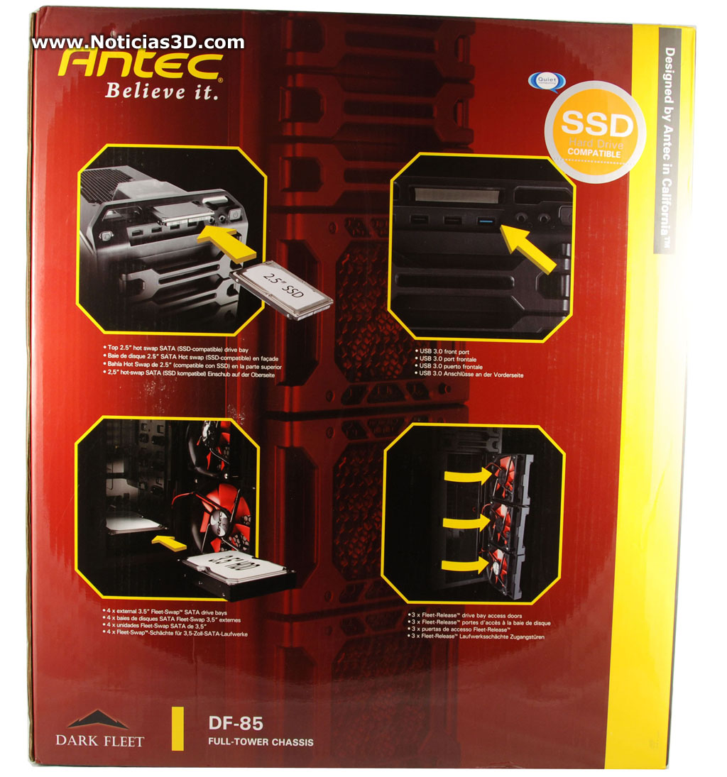 La caja... de la caja no nos muestra planos generales de la misma, sino los aspectos más destacados, como el frontal para discos de 2,5 pulgadas extraíbles, el frontal que se puede abrir para introducir mejor los discos, la cantidad de ventiladores instalados... En el otro lado, disponemos de varios planos de la unidad en los que podemos ver el interior de la DF-85 y algunas de sus propiedades, aunque no una imagen general, como ya hemos dicho.