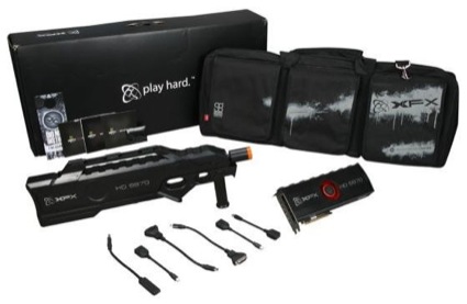 XFX no escatima en detalles e incluso la caja tiene un diseño relacionado con los juegos, ya que la tarjeta viene colocada dentro de una arma automática de plástico.